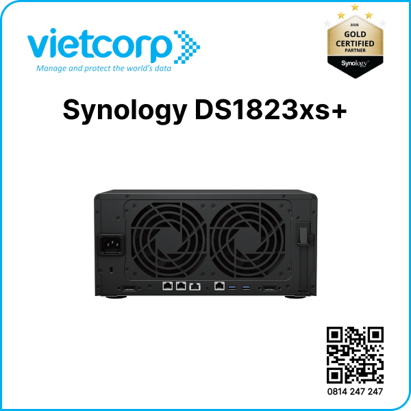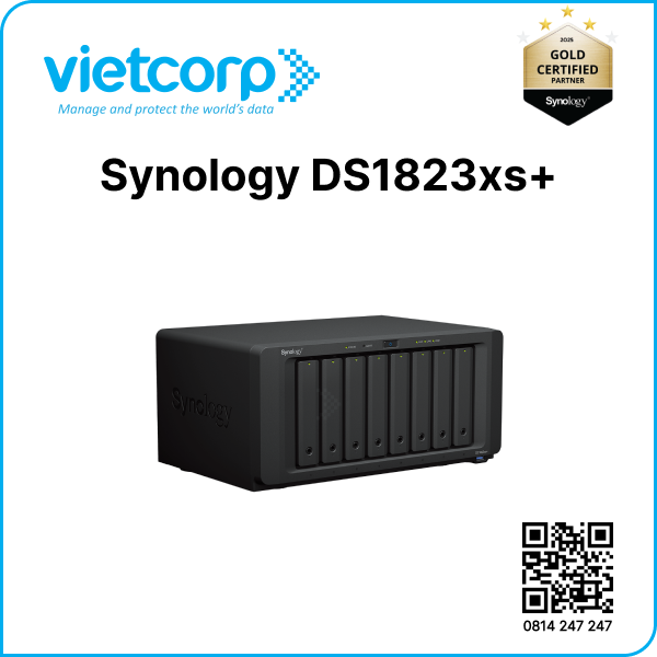 Synology DS1823xs+ là NAS để bàn 8 khay cao cấp, được thiết kế cho doanh nghiệp cần hiệu năng mạnh mẽ và khả năng mở rộng linh hoạt. Thiết bị trang bị CPU AMD Ryzen V1780B 4 Cores (3.35GHz, turbo 3.6GHz), đi kèm RAM DDR4 ECC 8GB (nâng cấp tối đa 32GB). DS1823xs+ hỗ trợ cả ổ cứng HAT5300, HAT3300 và SSD SAT5200, cùng 2 khe M.2 NVMe để tăng tốc với SSD cache.