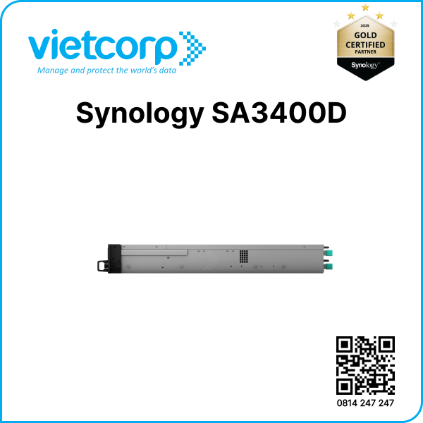 | Ghi chú | Synology High Availability là gói sản phẩm tích hợp cho SA3400D để tối ưu thời gian hoạt động của dịch vụ. SA3400D không hỗ trợ tạo cụm máy tính sẵn sàng cao với một thiết bị máy chủ khác. |