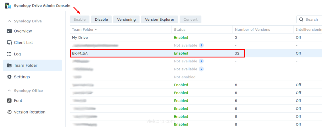 Bước 2: vào Synology Drive Admin enable folder BK-MISA trong Team Folder