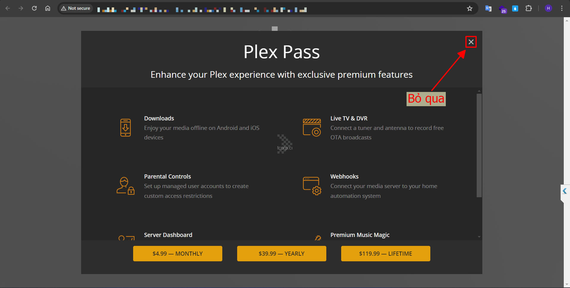 Bước 12: Đăng ký các gói tính năng của Plex Media Server -> Ta có thể tắt để bỏ qua
