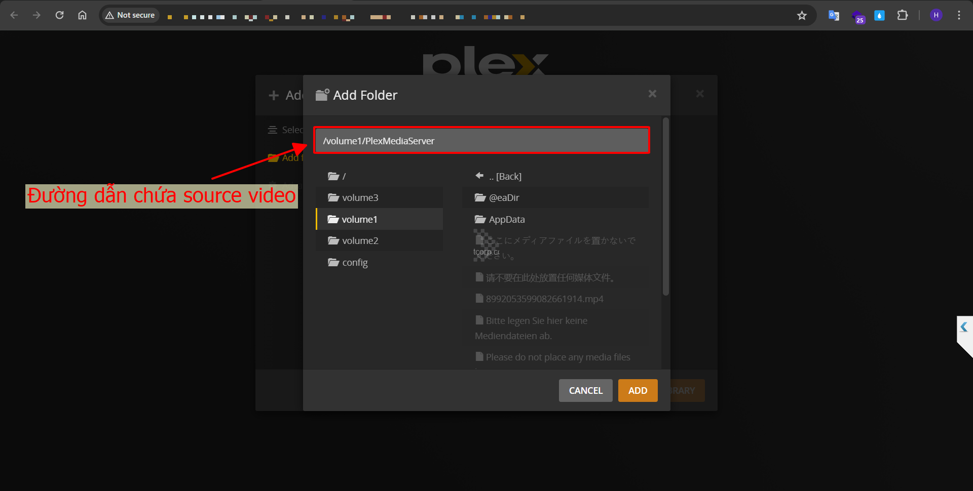 Chọn đường dẫn nơi chứa source thư mục trên Volume của NAS Synology -> Chọn ADD