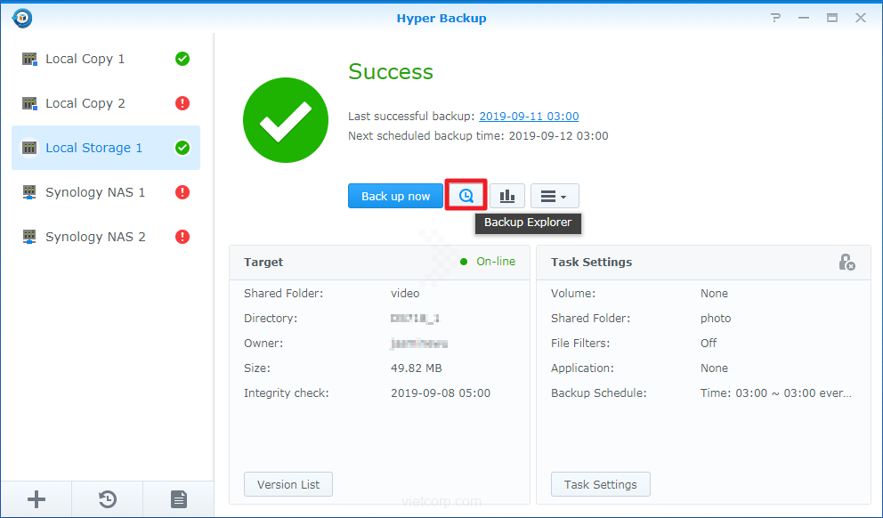 Hyper Backup cho phép bạn tạo các tác vụ sao lưu dữ liệu, xuất dữ liệu sao lưu sang các thiết bị lưu trữ bên ngoài, và khôi phục dữ liệu sao lưu khi cần thiết. Dữ liệu sao lưu trên đích sẽ được lưu trữ ở định dạng file .hbk do Synology cung cấp khi bạn tạo nhiều tác vụ sao lưu phiên bản. Chỉ có thể đọc file ở định dạng .hbk với Hyper Backup, Hyper Backup Explorer, và Hyper Backup Vault.