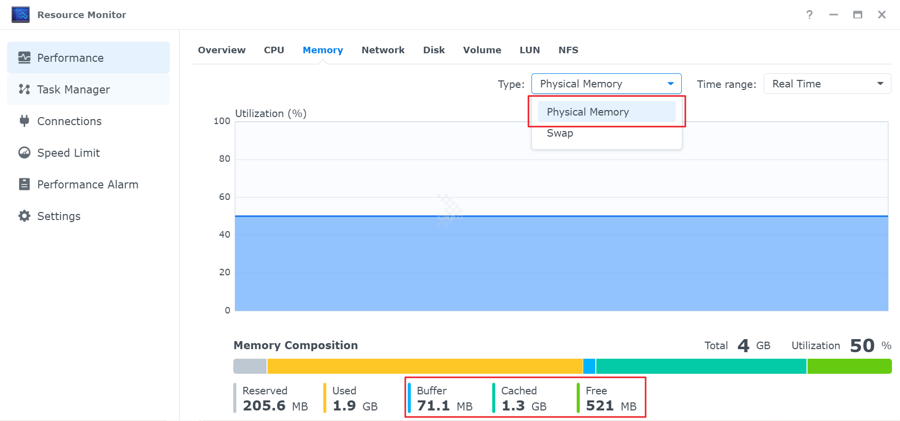 Sau khi đăng nhập vào DSM, đi tới Resource Monitor > Performance > Memory.