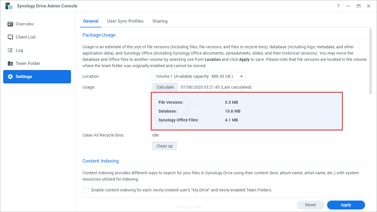 Vào Synology Drive Admin Console > Settings > General > Package Usage > Usage. Có sẵn ba số liệu: versions, cơ sở dữ liệu và Synology Office file.