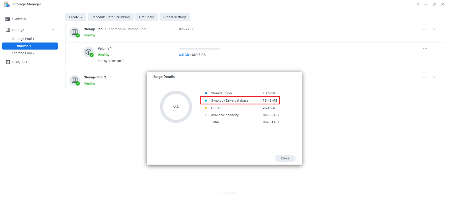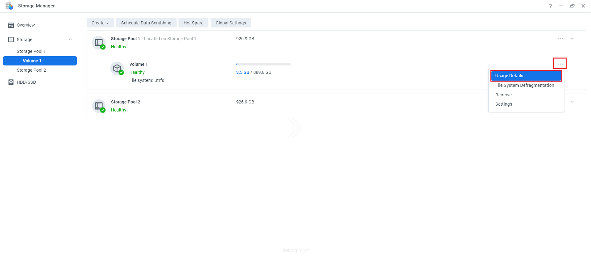 Vào DSM > Storage Manager > Storage, nhấp vào dấu chấm lửng ở bên phải ổ đĩa nơi đặt Synology Drive Server và chọn Usage Details. Bạn sẽ thấy chi tiết sử dụng của Synology Drive Server