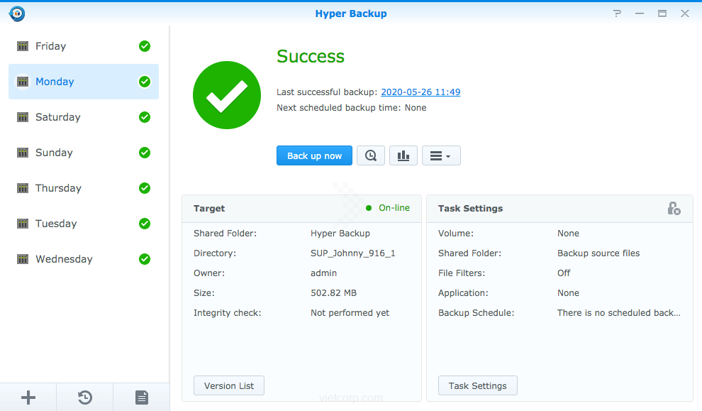 - Sau khi tạo tác vụ sao lưu , nếu thiết bị USB không được gắn vào NAS Synology, mục đích đến chứa dữ liệu sao lưu sẽ hiển thị off-line trên Hyper Backup