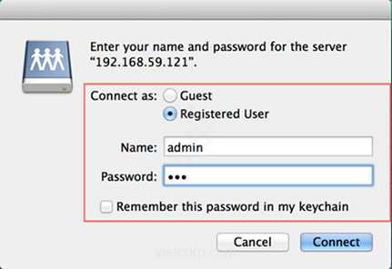 5. Nhập tên user và mật khẩu. Tài khoản người dùng của bạn phải có quyền read/write thích hợp cho thư mục dùng chung mà bạn muốn truy cập. Click Connect để tiếp tục.