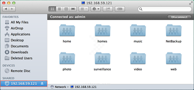 6. Cuối cùng, nếu thông tin đăng nhập user name của bạn là chính xác, bây giờ bạn sẽ thấy NAS Synology của bạn được liệt kê trong phần Chia sẻ của cửa sổ Finder. Bấm đúp vào thư mục chia sẻ để khám phá nội dung của nó.