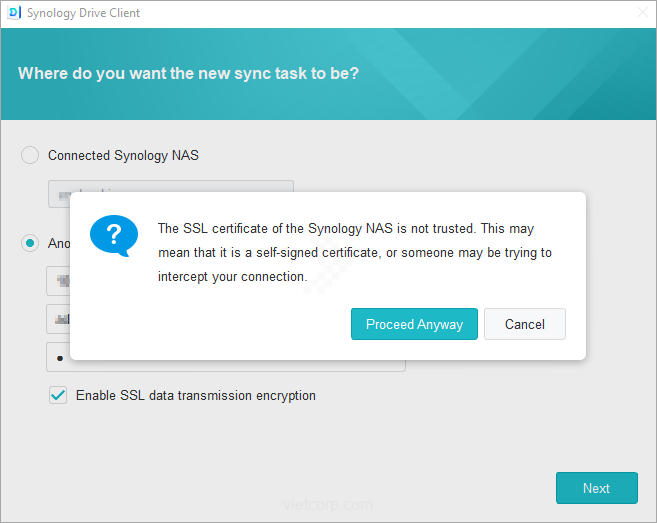 Synology Drive Client và Synology Cloud Station người dùng đôi khi có thể gặp SSL (Secure Sockets Layer) cảnh báo khi tạo tác vụ đồng bộ hoặc sao lưu. SSL liên quan đến cách bạn kết nối với máy chủ, chẳng hạn như sử dụng private IP, public IP, DDNS, etc. Chứng chỉ SSL không đáng tin cậy chủ yếu là do kết nối sử dụng QuickConnect hoặc DDNS mà không có chứng chỉ SSL từ tổ chức phát hành được ủy quyền.