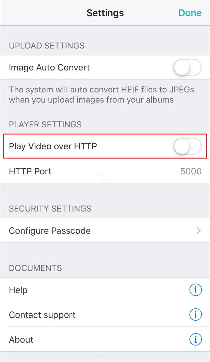 - Vào app Settings và chuyển đổi để bật Play Video over HTTP.