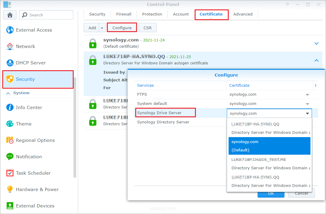 - Mở trình duyệt và kết nối với NAS Synology của bạn bằng DDNS qua HTTPS để kiểm tra xem bạn có nhận được cảnh báo SSL hay không. Nếu có, hãy đăng ký chứng chỉ (e.g., Let’s Encrypt) bằng cách truy cập DSM Control Panel > Security > Certificate, và thêm chứng chỉ vào NAS Synology của bạn. Sau đó nhấp vào chứng chỉ và click Configure. Đảm bảo rằng chứng chỉ này được áp dụng cho Synology Drive Server hoặc Synology Cloud Station.