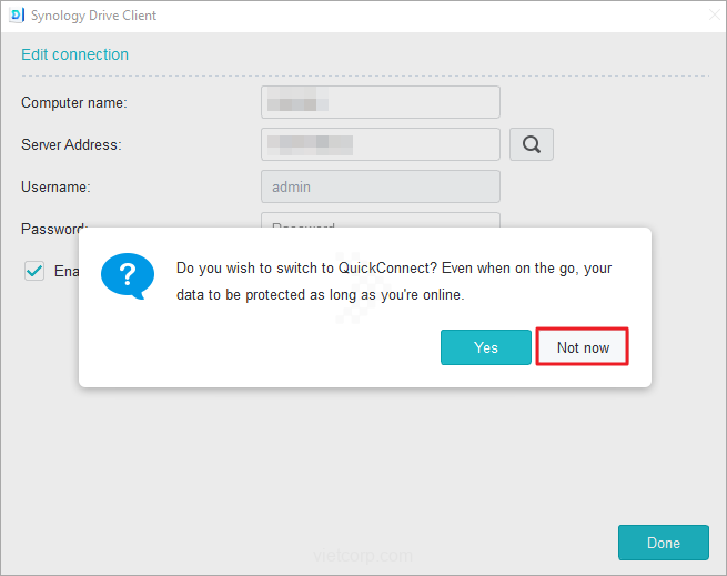 - Truy cập DDNS qua HTTPS để xác nhận xem chứng chỉ đã được áp dụng hay chưa. Khi tạo tác vụ đồng bộ hóa trên Synology Drive Client hoặc Synology Cloud Station, vui lòng sử dụng DDNS làm tên máy chủ và mở port 6690. Chọn Not now khi cửa sổ bật lên sẽ hỏi bạn có muốn chuyển kết nối sang QuickConnect hay không.