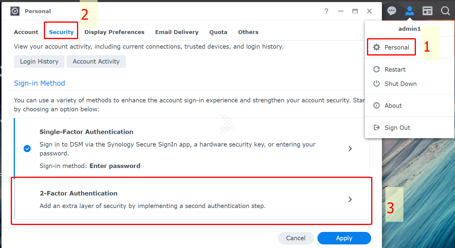 Bước 1: Đăng nhập vào tài khoản quản trị DSM trên web portal > Personal > Security, sau đó chọn 2-Factor Authentication. (tương tự phía trên).