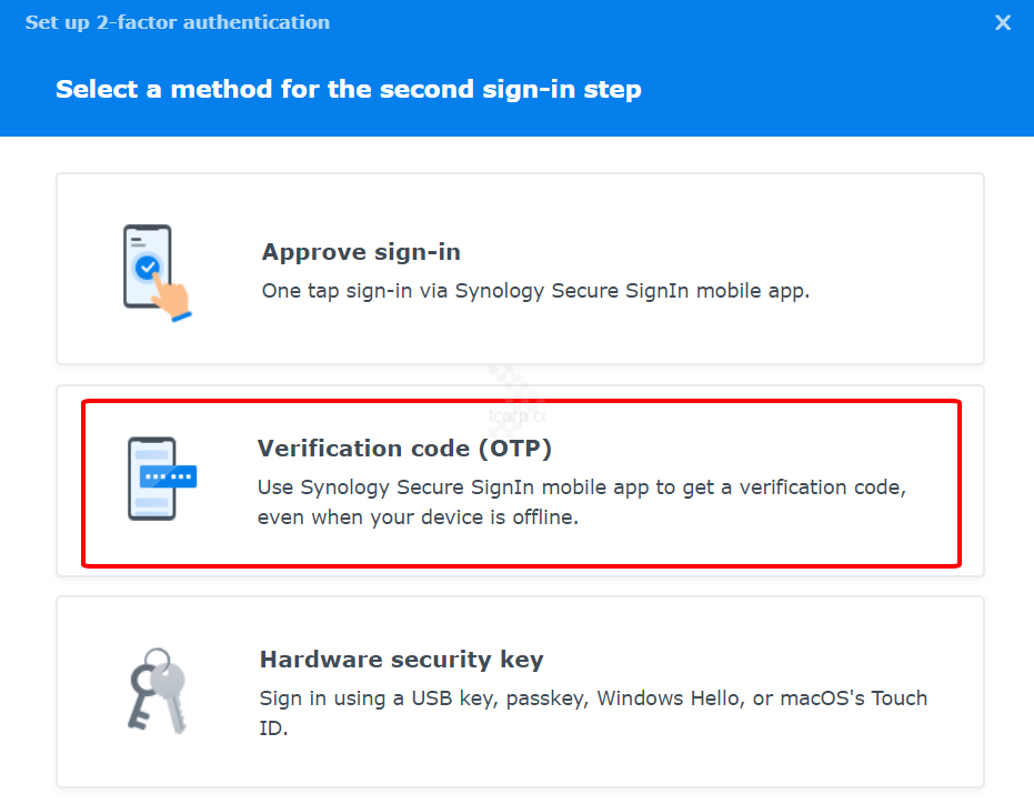 Bước 2: Chọn Verification code (OTP), nhập mật khẩu tài khoản của bạn.