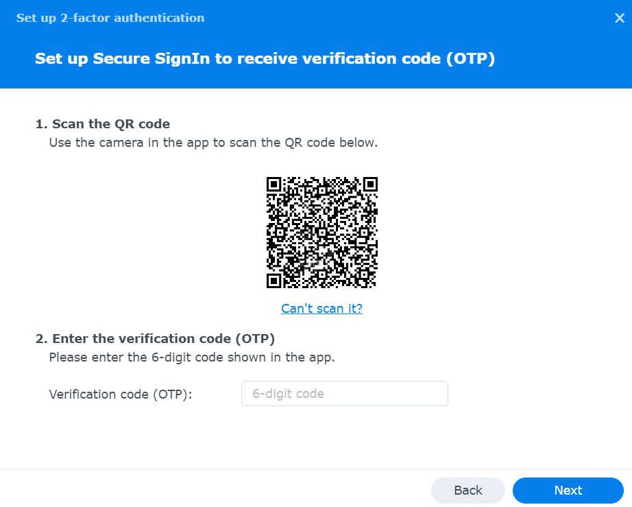 Bước 3: Bấm Next, quét mã QR để ứng dụng Synology Secure SignIn tạo mã xác thực OTP trên điện thoại sau đó nhập mã OTP vào web portal.
