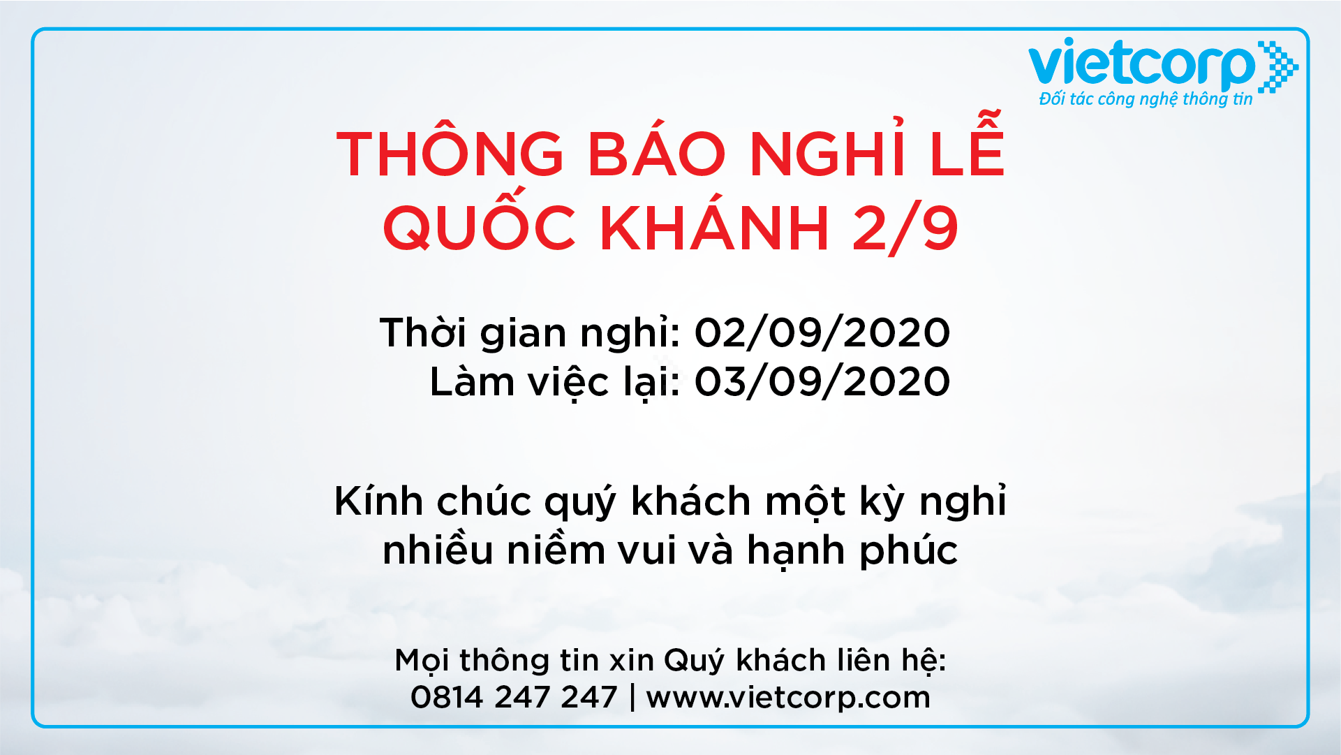 Cảm ơn quý khách đã ủng hộ Vietcorp trong thời gian qua. Vietcorp xin thông báo thời gian nghỉ lễ Quốc Khánh 2/9/2020 như sau: