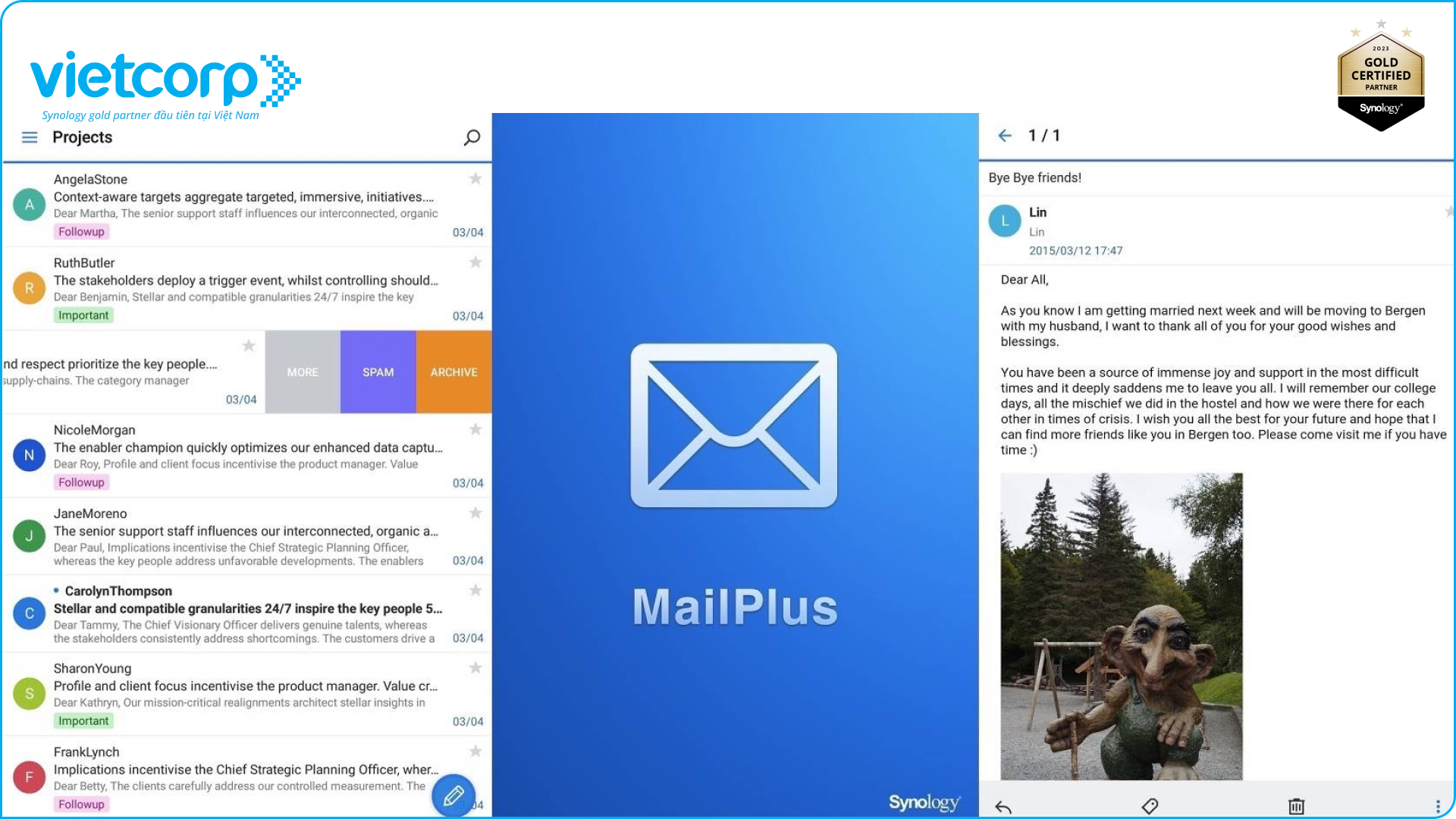 Synology đã phát hành toàn bộ gói ứng dụng chính thức về năng suất, trong đó Synology MailPlus là một trong số đó. Synology MailPlus có sẵn cho các ứng dụng di động iOS và Android và cung cấp giao diện người dùng dựa trên web cho người dùng PC và Mac.