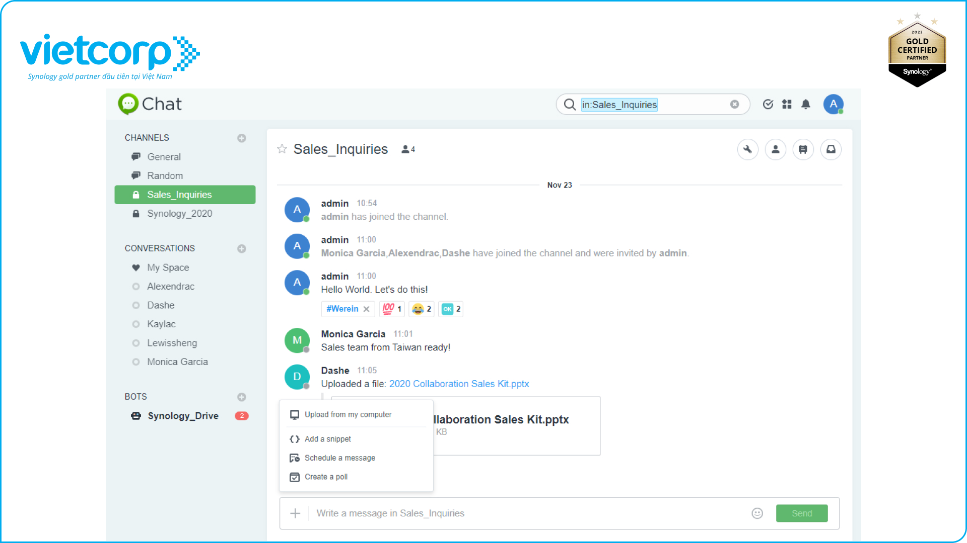 - Synology Chat đảm bảo tính bảo mật và quyền riêng tư với mã hóa end-to-end và khả năng kiểm soát truy cập chi tiết.