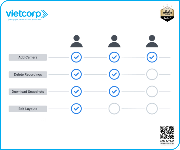 Trong các tổ chức lớn có nhiều địa điểm và camera, việc có quyền truy cập vào phân quyền vai trò là rất quan trọng. Tính năng này cho phép quản trị viên nhanh chóng phân công trách nhiệm cụ thể cho những người dùng khác nhau đồng thời hạn chế quyền truy cập của họ vào các tính năng hệ thống khác.