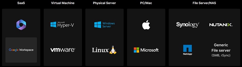 Tập trung các bản sao lưu của VMware, Micosoft Hyper-V, Windows, MacOS, Linux, Netapp, Nutanix, Microsoft 365 và Google Workspace để đảm bảo khả năng khôi phục nhanh và duy trì tính sẵn sàng của dịch vụ.