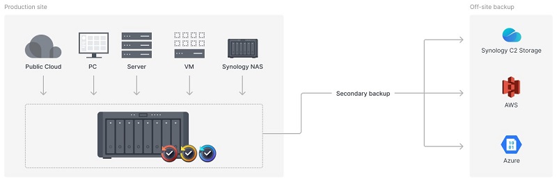 Khám phá các giải pháp sao lưu Synology để bảo vệ các bản sao lưu và sao chép dữ liệu ngoài cơ sở, lên các máy chủ riêng của chúng tôi cũng như các đám mây công cộng.