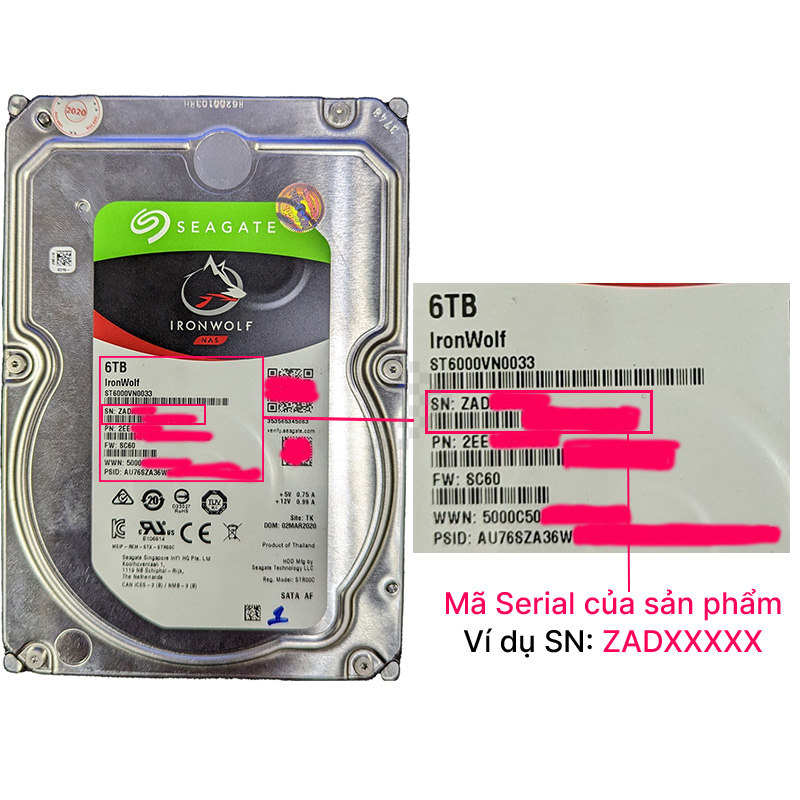 Trên ổ cứng ghi các thông sốnhư: Dung lượng ổ cứng, mã model….và Mã Searial của sản phẩm(ví dụ như: SN: ZADRT7XB,trong đó ZADRT7XB là mã Serial của sản phẩm)
