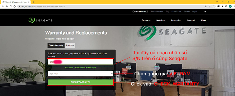 Bước 1: Truy cập vào Website: https://www.seagate.com/as/en/support/warranty-and-replacements/ Đây là trang web chính thức của Seagate cho phép kiểm tra chính xác thời hạn bảo hành các mã sản phẩm mà Seagate cung cấp trên thị trường toàn cầu.
