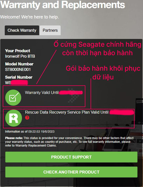 Trong trường hợp này sẽ hiển thị: ô vuông có dấu tích chữ V và thời hạn bảo hành đến bao lâu. Ví dụ như ổ Ironwolf Pro có thời hạn bảo hành lên đến 5 năm sẽ hiển thị: June 19, 2028. Ngoài ra một số dòng ổ cứng có gói dịch vụ khác như: gói dịch vụ khôi phục dữ liệu….