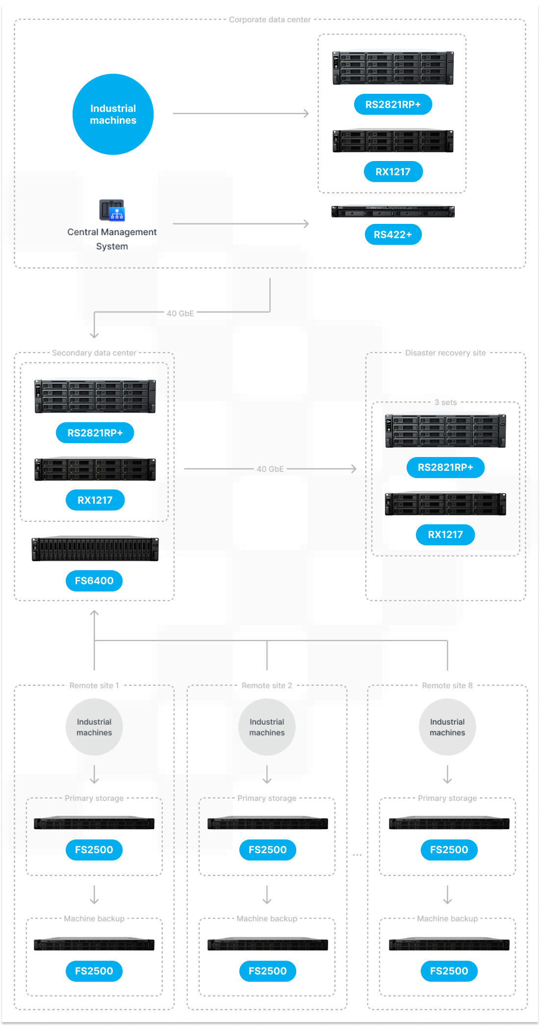 Để quản lý dễ dàng 8 địa điểm sản xuất, biện pháp cho doanh nghiệp là sử dụng Synology làm kho lưu trữ VM và điểm đích sao lưu cho các máy công nghiệp của họ. Giải pháp được đề xuất là sử dụng Synology FS2500 là máy chủ NAS đáng tin cậy và tiết kiệm chi phí, có thể dễ dàng triển khai trên nhiều địa điểm và được định cấu hình từ xa sau khi cài đặt. Tận dụng tính khả dụng cao với hệ thống NAS Synology để đảm bảo rằng doanh nghiệp có thể duy trì hoạt động, ngay cả khi các máy chủ chính bị hỏng hoặc mất điện.