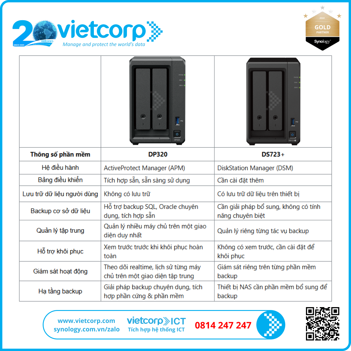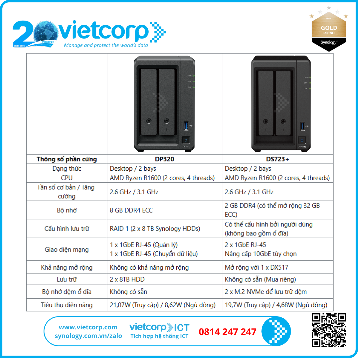 Nhận xét: DP320 bị giới hạn trong vai trò sao lưu, trong khi DS723+ là một “con dao Thụy Sĩ” với khả năng đáp ứng hầu hết mọi nhu cầu. Nếu bạn chỉ cần sao lưu, DP320 đủ dùng; nhưng nếu muốn một thiết bị đa năng, DS723+ là lựa chọn rõ ràng.