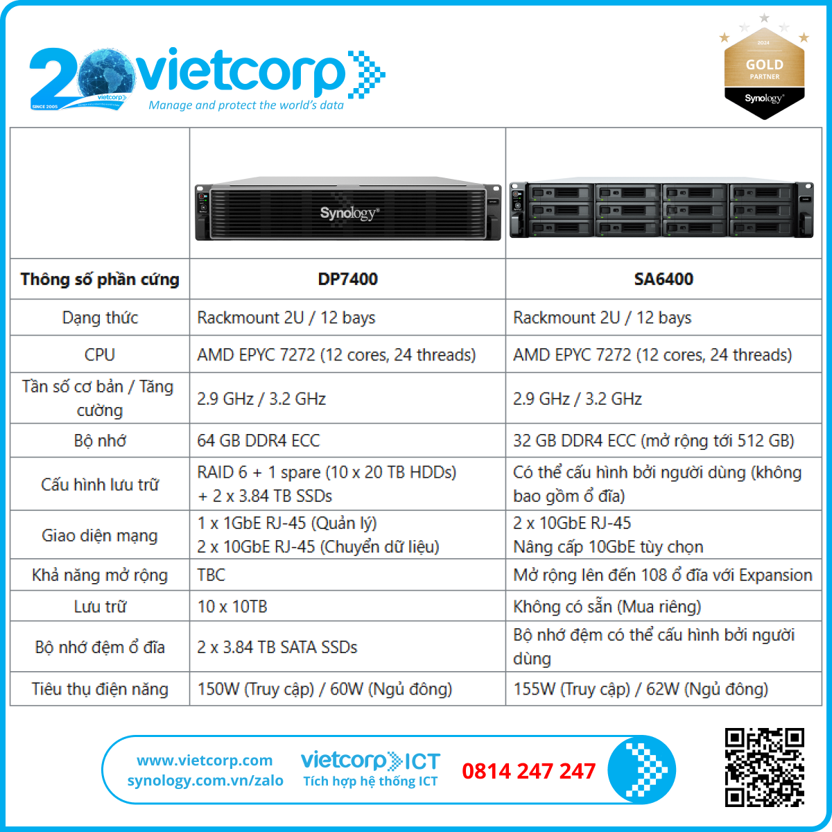 Kết luận: Cả hai đều sử dụng CPU mạnh mẽ AMD EPYC 7272, nhưng SA6400 vượt trội về khả năng nâng cấp RAM (lên đến 1TB) và mở rộng lưu trữ. DP7400 tập trung vào hiệu suất sao lưu hơn là khả năng mở rộng phần cứng.