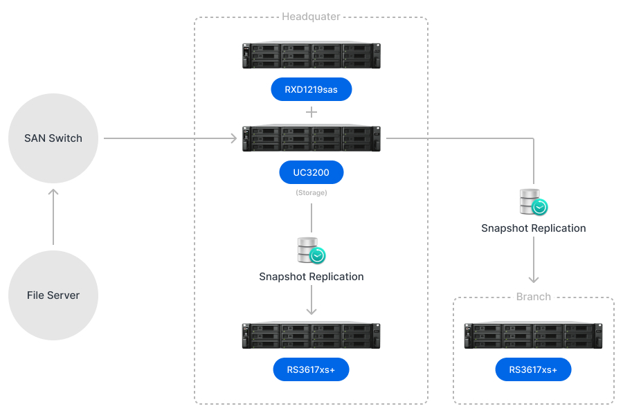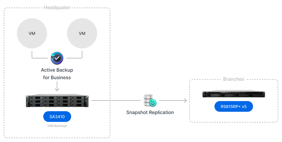 Bên cạnh đó, để thêm một lớp bảo vệ dữ liệu bổ sung, công ty đã thực hiện snapshot ngoại vi bằng cách sử dụng Synology Snapshot Replication hàng ngày. Đội ngũ IT đã cài đặt năm máy chủ Synology RackStation loại 4 khay tại các chi nhánh bên ngoài để chúng phục vụ như điểm đến sao chép dữ liệu từ máy chủ sao lưu VM. Công nghệ snapshot bất biến cũng được áp dụng để giảm thiểu rủi ro về an ninh và sự cố do tác động thủ công.