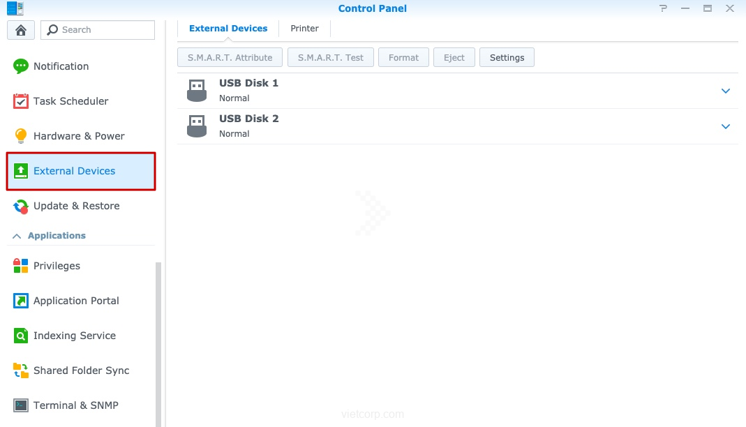 1. Đảm bảo bạn đã kết nối thiết bị USB của mình đúng cách với NAS Synology và bạn có thể nhìn thấy thiết bị tại Control Panel > External Devices.