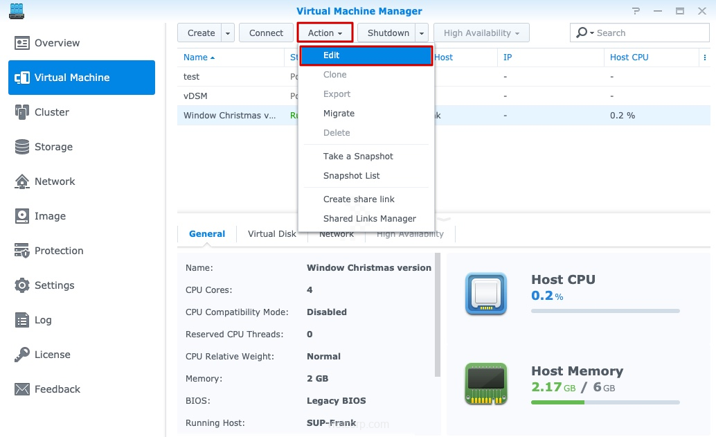 2. Vào Virtual Machine của Virtual Machine Manager và chọn một máy ảo. Click Action > Edit